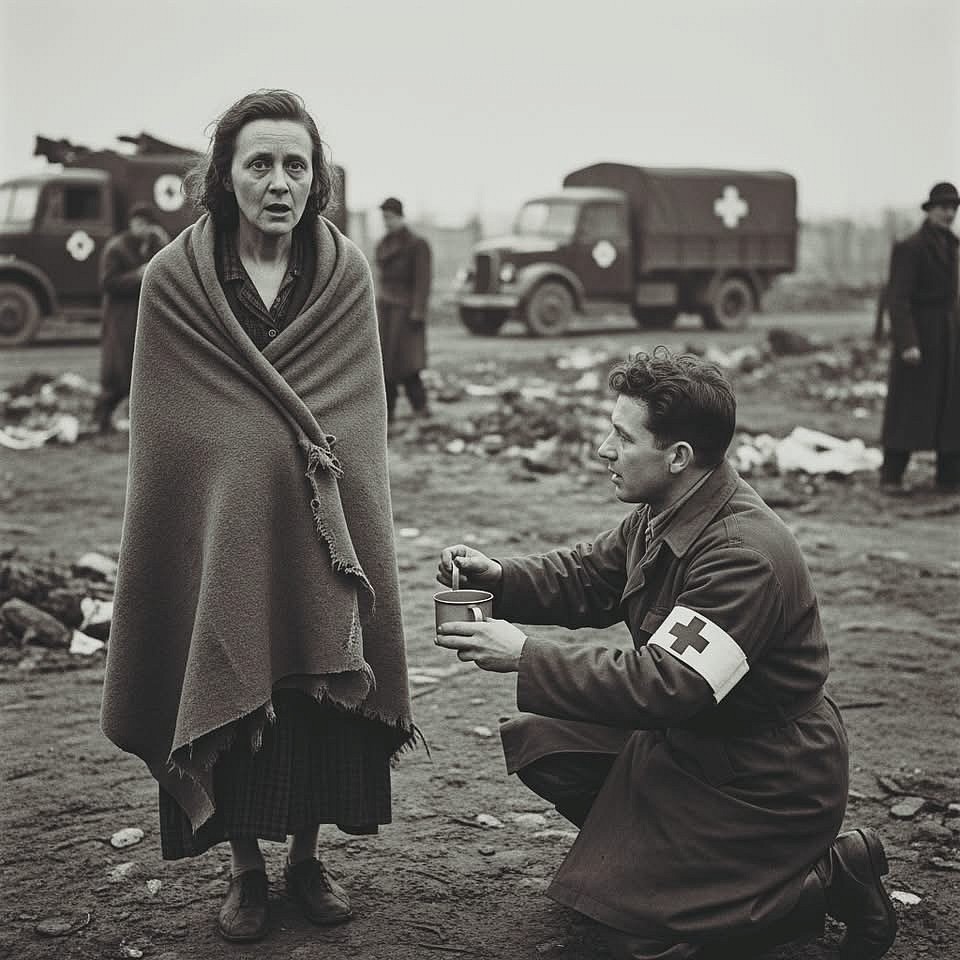 Storia di una sopravvissuta — Bergen-Belsen, 1945 Quando i soldati britannici entrarono a Bergen-Belsen nell'aprile del 1945, trovarono un mondo che somigliava a malapena alla vita. Tra i sopravvissuti c'era una giovane donna fragile di nome Miriam, avvolta in una coperta lacera che aveva barattato con una crosta di pane settimane prima. Rimase completamente immobile mentre i camion carichi di cibo e medicine arrivavano, come se temesse che il momento potesse svanire se si fosse mossa. Un medico le si avvicinò con una tazza di latta piena di brodo. Quando la sollevò, le sue mani tremarono così violentemente che metà del contenuto si rovesciò a terra. Sussurrò: "Pensavo che non sarebbe mai venuto nessuno". Il medico le posò delicatamente la mano sulla sua, tenendo ferma la tazza e guidandola verso le labbra. I suoi occhi, infossati ma vivi, lo guardavano come se stessero memorizzando il volto di qualcuno che l'aveva tirata fuori da un incubo. Più tardi, mentre sedeva vicino a un fuoco improvvisato, un altro sopravvissuto le drappeggiò un cappotto sulle spalle. Per la prima volta da anni, Miriam sentì un calore che non derivasse dalla febbre o dalla paura. La liberazione non era solo l'arrivo dei soldati: era il ritorno di piccoli gesti umani che pensava il mondo avesse dimenticato.