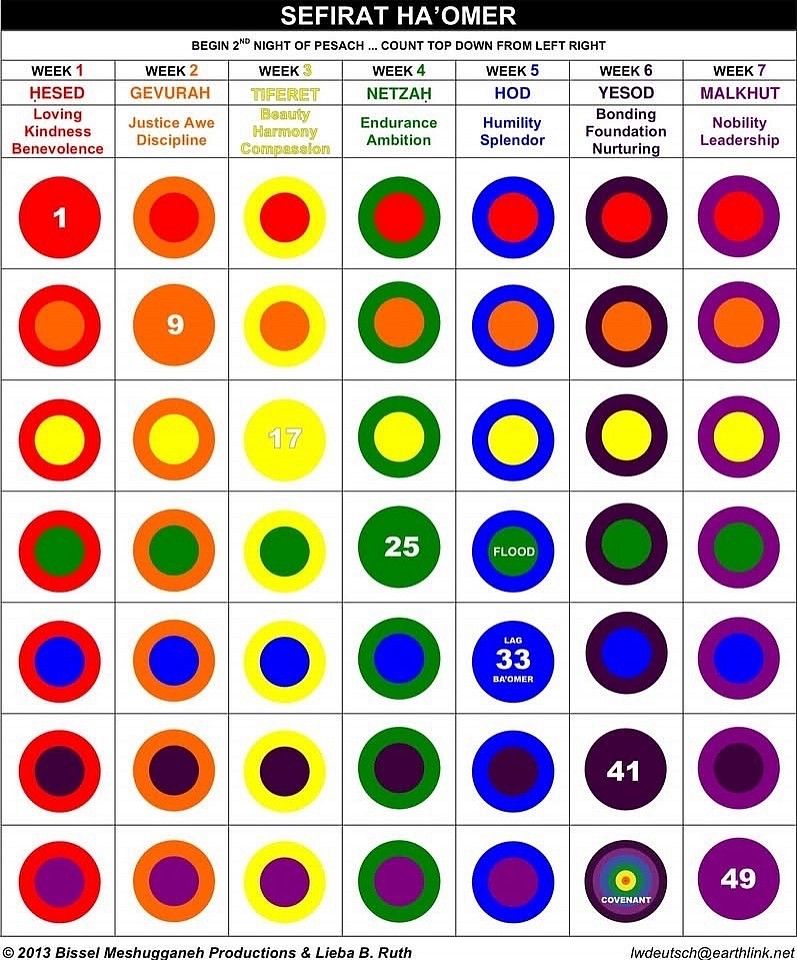 Ogni Sefirà dei nostri attributi emotivi rappresenta un aspetto della nostra anima: Khèssed (Amore, Bontà), Ghevurà (Forza, Rigore), Tifèret (Bellezza, Equilibrio, Armonia) ecc. fino a Malkhùt. Tuttavia ogni Sefirà a sua volta contiene tutti gli altri sei aspetti emozionali, ad esempio l’ “aspetto dell’anima” di Hod (Splendore, Umiltà) contiene in sé tutti gli altri sei aspetti: Khèssed (Amore, Bontà), Ghevurà (Forza, Rigore), Tifèret (Bellezza, Equilibrio, Armonia), Nètzakh (Vittoria, Perseveranza), Yessòd (Fondamento, Legame) e Malkhùt (Regno, Regalità Organizzazione, Comunicazione). In più oltre i 6 attributi esiste il settimo che è la sua essenza: ogni volta che si arriva al giorno relativo a quell’attributo stesso (ad esempio Bontà nella Bontà) noi non rettifichiamo solo un aspetto esteriore di esso ma la sua base; ad esempio il primo giorno Khèssed di Khèssed, o dello Splendore nello Splendore Hod (il 33° Giorno dell’Òmer) ecc. così via in ogni giorno dove troviamo l’interclusione del sentimento che è lo stesso della Sefirà.Quindi ogni settimana noi rettifichiamo la Sefirà di quell’aspetto emozionale, ad esempio nella seconda settimana di Ghevurà, Rigore + 6 delle sue sfaccettature in totale 7. Questo per 7 volte.Quindi 7 settimane × 7 = 49 giorni dell’Òmer.